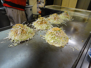 大阪のお好み焼きと違い、薄焼きの上にそば麺と野菜をたっぷり使って作るのが広島のお好み焼きです |